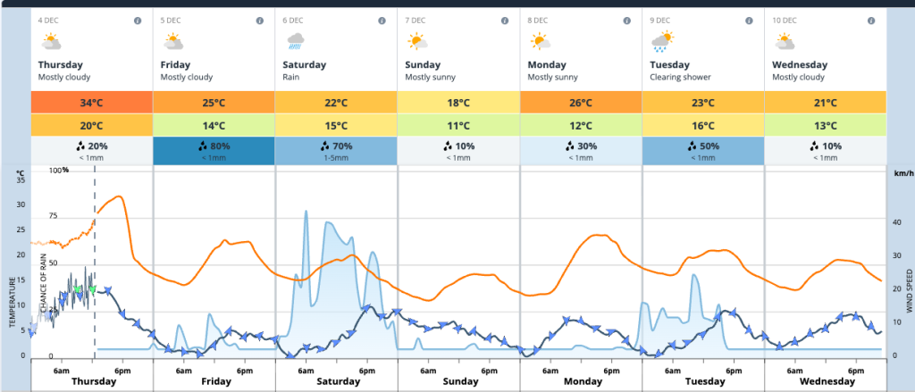 メルボルンの今週は、木曜に最高34℃の真夏日となった後、金〜土にかけて雨や曇りで気温が下がり、日曜には18℃前後まで冷え込むものの、週明けには再び20℃台後半の暖かさが戻るなど上下の変動が大きく、雨の可能性も断続的に続く不安定な天候となる見込みですので、みなさまどうぞ体調管理と服装調整に気をつけてお過ごしください。