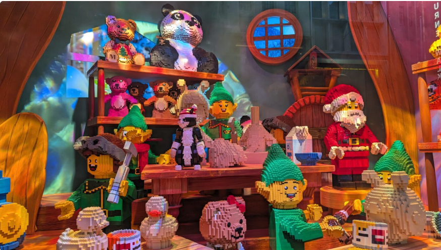 さらに、夕方以降には、店舗正面の壁面に映像と音響を使った “Christmas Light Show” が投影され、家族連れや LEGO ファンにとって1日無料で楽しむことができる体験となっています