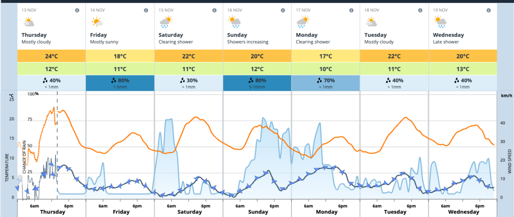 今週のメルボルンは、晴れと雨が交互に訪れる少し不安定なお天気になりそうです。週の前半(木〜金)は、木曜日にやや蒸し暑くなるものの、金曜日には気温が下がり、一時的に雨が降る予報です。朝晩は肌寒く、軽いジャケットがあると安心そうですね。